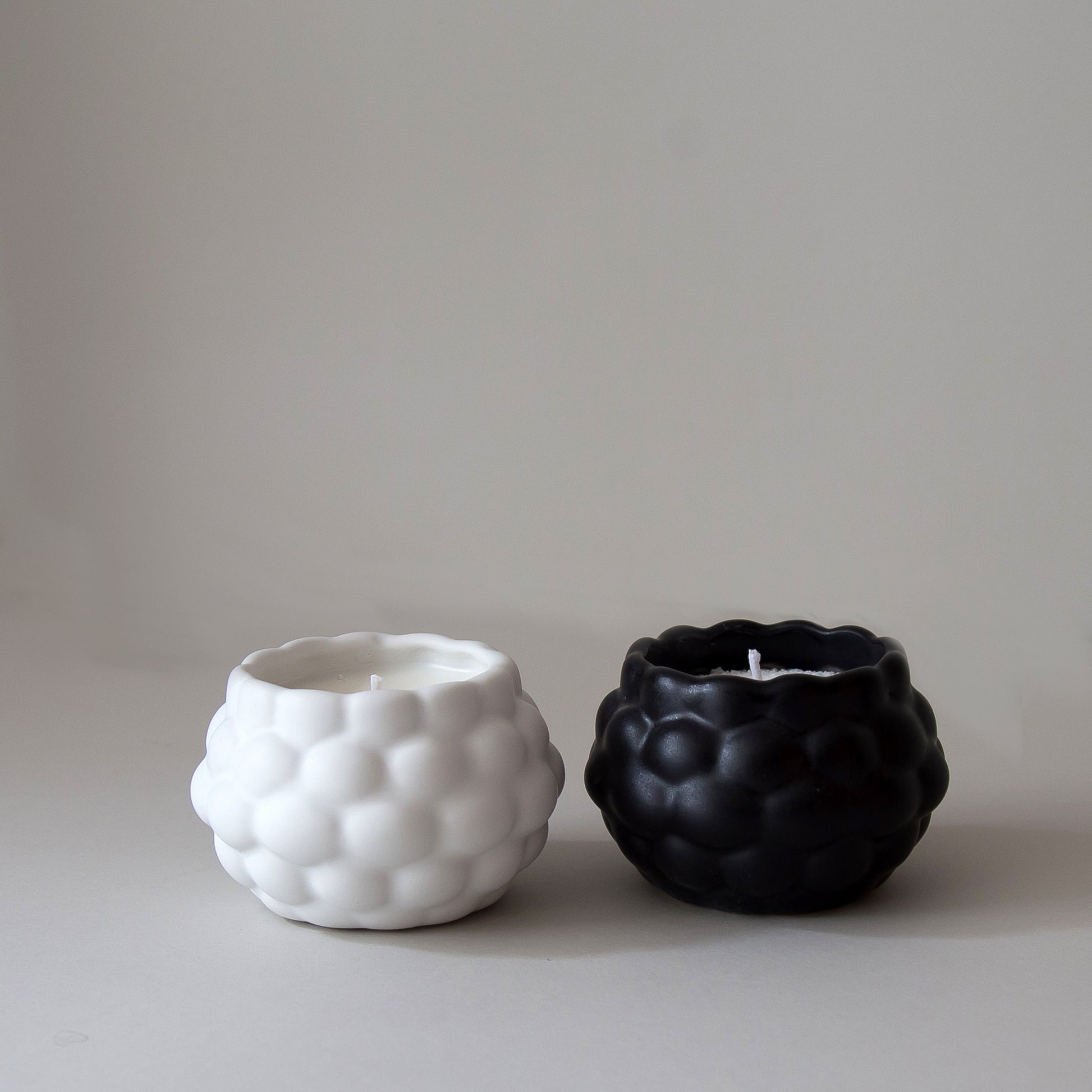 Handcrafted candle in a matte ceramic container with a raised bubble design, available in white and black. It combines modern aesthetics with warmth, making it ideal for creating ambiance and adding a decorative touch.
